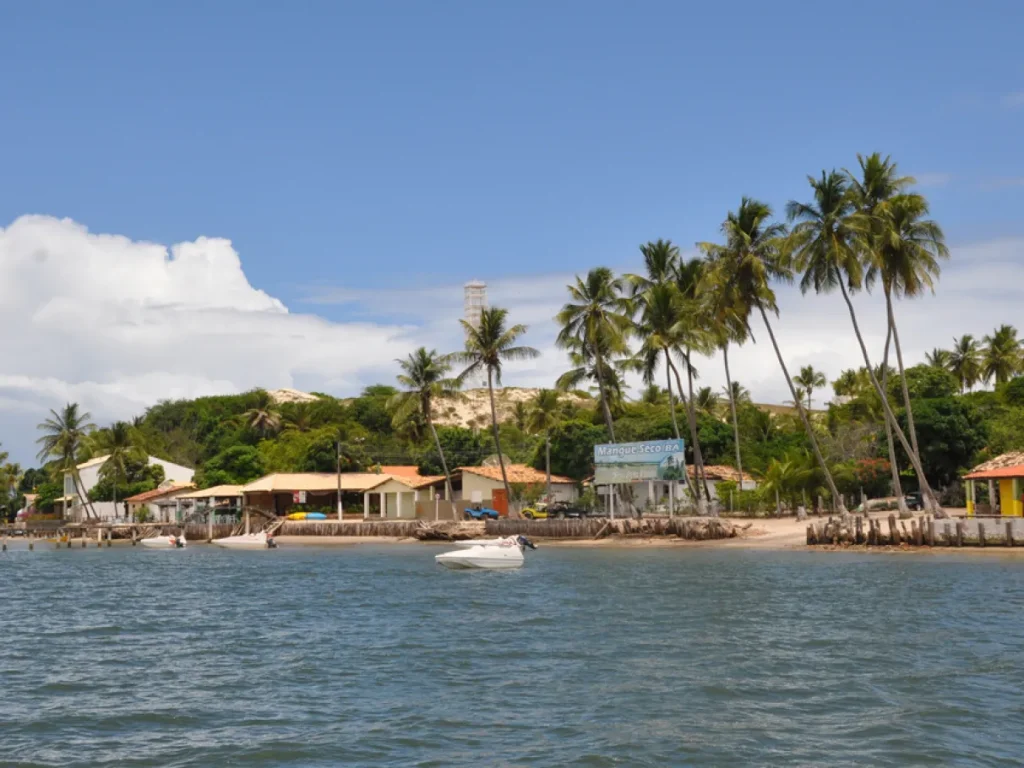A vila de Mangue Seco é conhecida por suas paisagens naturais com dunas, coqueirais e praias extensas, além do ambiente tranquilo de uma pequena comunidade litorânea.