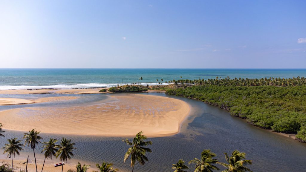 O cenário combina coqueiros, vegetação nativa, dunas e o contraste entre o azul do mar e as águas do rio.